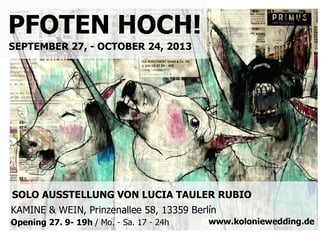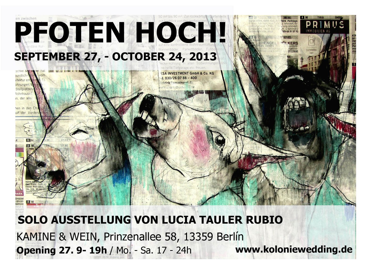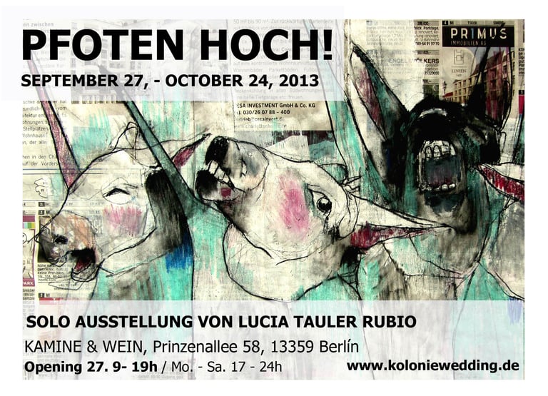 Exposición individual en Kamine & Wein, tienda de vinos y chimeneas. Este lugar acogedor, de encuentro e intercambio acogió la primera exposición de la artista madrileña en Berlín. Un grito de protesta, inspirado en la ora de Orwell, Rebelión en la Granja. Una búsqueda de identidad en un entorno desconocido, lleno de fuerza y presencia.